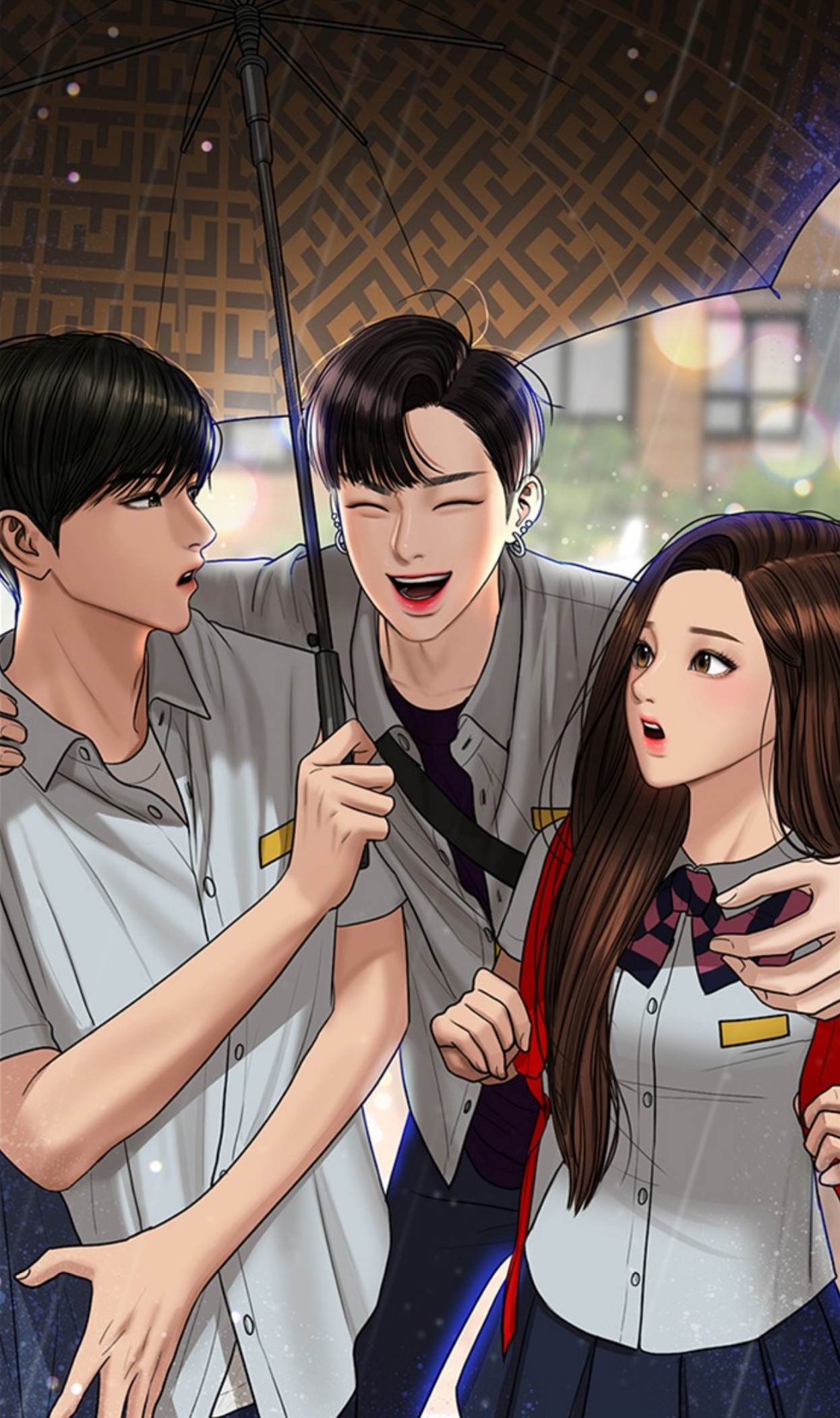 Suho, Seojun, and Jugyeong share an umbrella. |